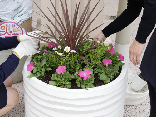 慣れない作業ながらも天候に恵まれ、楽しく植え込みができました。クルーズ船からのお客様をフラワーポットがお出迎えします。